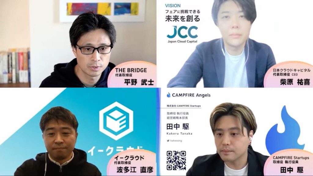 「Biz/Zine」に、1月20日開催の「BRIDGE Tokyo 2022」セッションのレポートが公開されました。登壇者はイークラウド代表の波多江、株式会社CAMPFIRE Startups 取締役 執行役員 田中駆氏、株式会社日本クラウドキャピタル(現 株式会社FUNDINNO、2月1日に社名変更) 代表取締役 CEO 柴原祐喜氏、モデレーターは、THE BRIDGE 代表取締役 平野武士氏です。